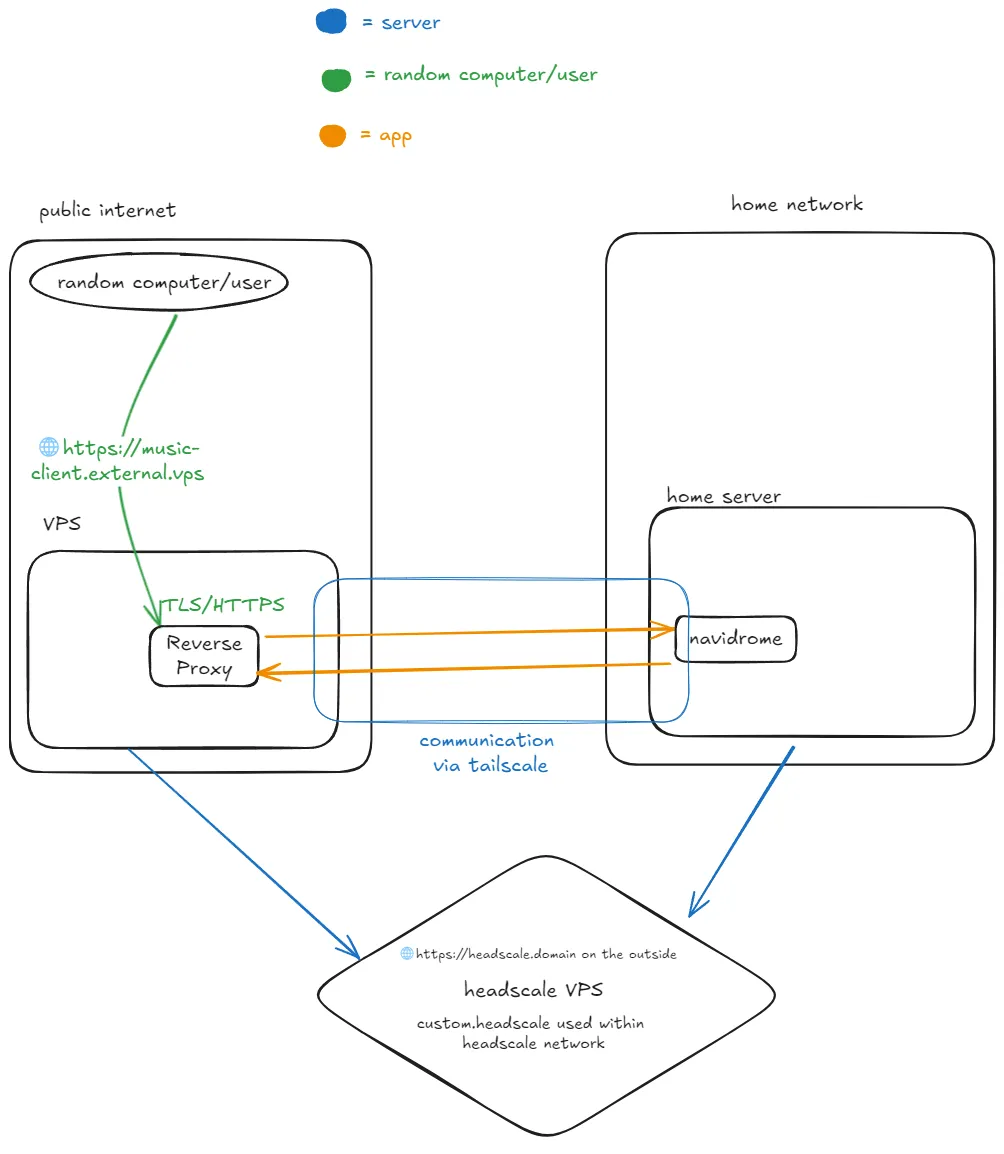 Section titled “How it works”The way that this works is pretty simple. Your VPS and home server would both be connected to the same Headscale tailnet. You would have a service on your home server accessible that is accessible to that VPS. On the VPS, you would then reverse proxy that connection, making the service accessible under a nice domain and with HTTPS. You’re getting a domain and HTTPS as the domain belongs to the VPS, and the VPS is also handling TLS via its own reverse proxy.